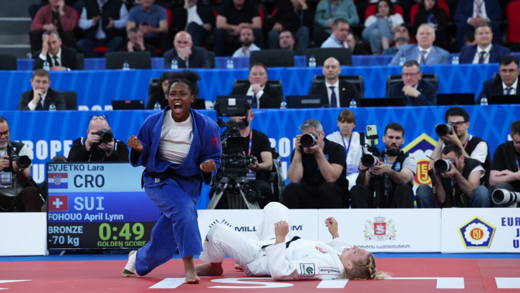 Just inside the last minute of normal time, Fohouo regained composure and equalised and with that went into golden score, ahead penalty-wise. A minute later she used a sasae-style movement to throw Cvjetko for ippon. The 20-year-old Swiss athlete has her first senior milestone medal.