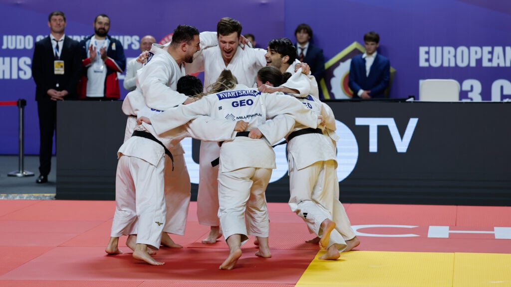 Terashvili wasted no time. He went straight for his signature uchi-mata, the same technique that won him the earlier contest, and it was as if someone had hit the replay button. Preve was thrown for ippon, and the Georgian team erupted in celebration. They had officially defended their U23 European Mixed Team title. After his decisive win, Terashvili shared his thoughts:
