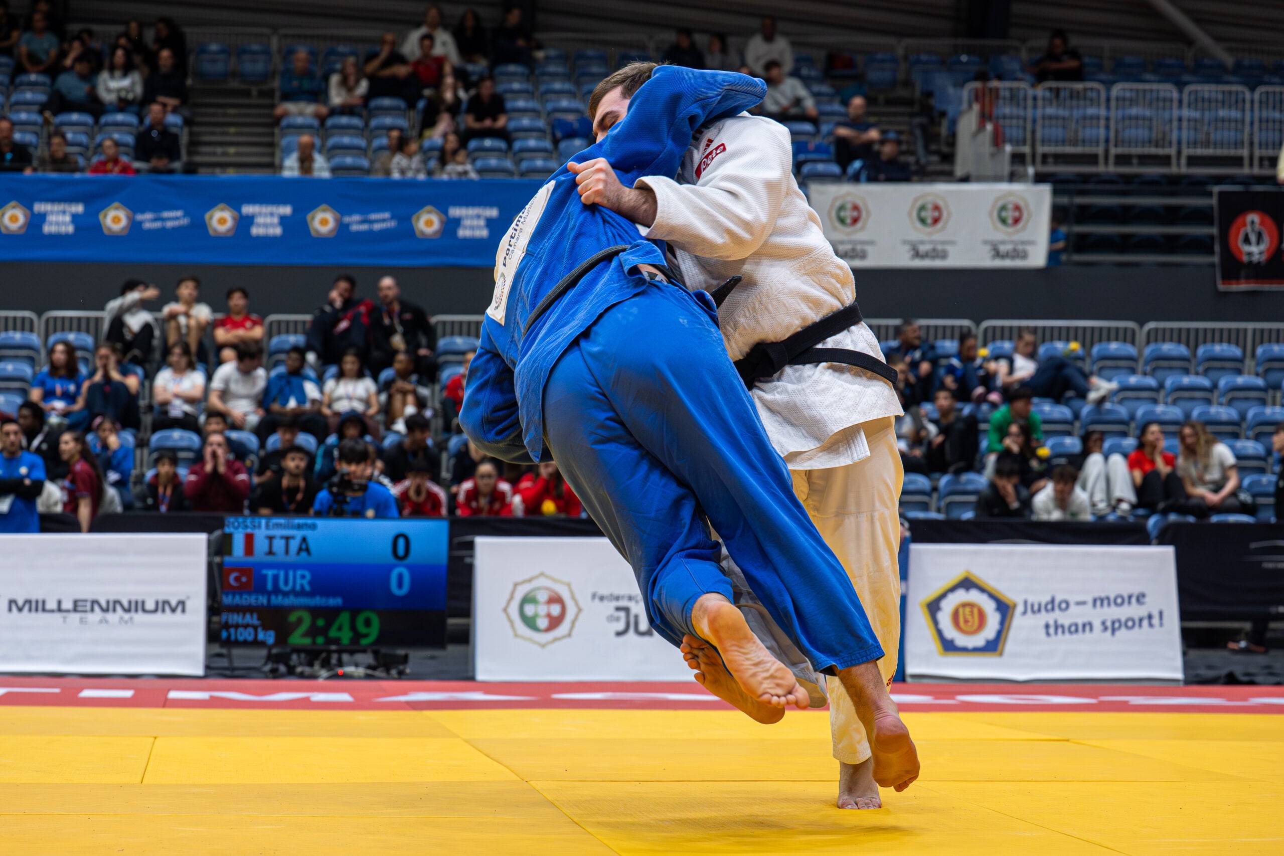 In the men’s competition, the highlight of the day came from Italy’s Emiliano Rossi, winner of the +100kg category. After defeating all his opponents, the athlete’s joy was evident to everyone present in the arena. With this gold medal, Rossi completes a particularly special journey in Portugal. After winning bronze in Coimbra in 2024 as a cadet and silver in Portimão in 2025 as a junior, the Italian now adds gold to his collection, completing the full set of medals from competitions held in Portugal.