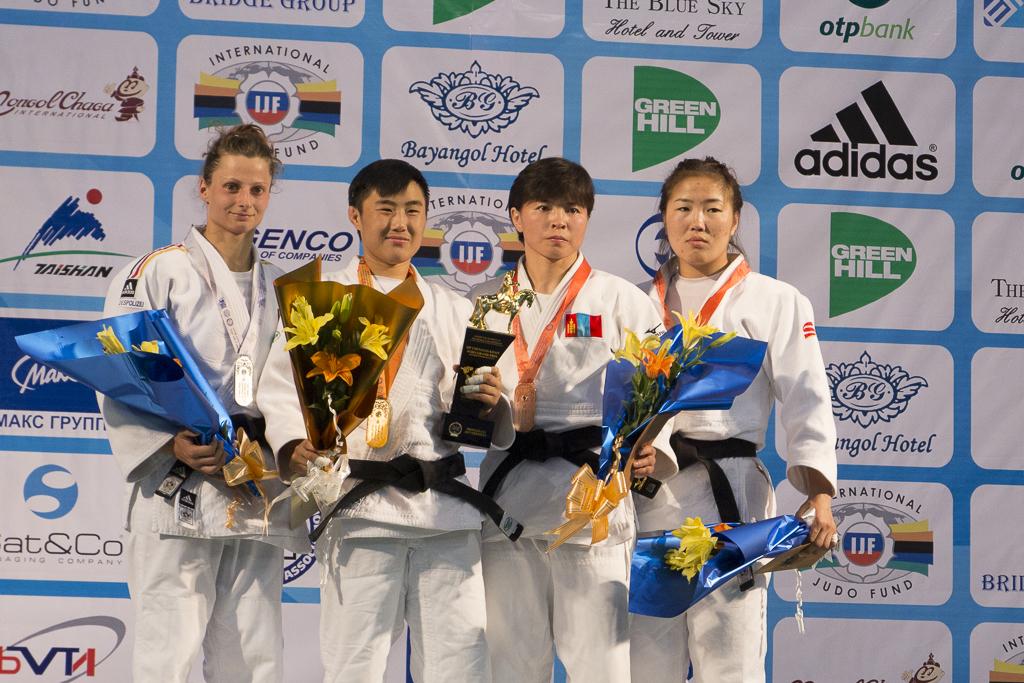 Germany’s Mareen Kraeh collected her fourth IJF Judo World Tour medal of the year when she took silver today at the IJF Chinggis Khan Grand Prix in Ulaanbaatar. Kraeh had a blistering start in the -52 kilo category throwing Mongolia’s Tseregbaatar Khulan first with tewaza for wazari then following up with ouchigari for ippon all within the first minute. Next up was Hungarian Maros Barbara who posed Kraeh more problems than in her opening contest. Nevertheless, Kraeh disposed of Maros with a fine piece of newaza. In the semi-final she faced her German teammate Romy Tarangul in tough battle that went the distance. Kraeh scored twice, first for yuko then for wazari to take the contest and make her way to the final to face Ma Yingnan CHN. “I found Ma to be a very strong opponent and had difficulty in securing a good grip”, said Kraeh. A slip by Kraeh put Ma ahead by yuko and the Chinese followed up in newaza pinning Kraeh for 12 seconds to add a second yuko. However, Kraeh was not fully able to escape and fell back uncomfortably into osaekomi where she tapped out after a few seconds. “Of course winning a silver medal is good but naturally I would have liked to have won gold as it is a medal I seem to be missing out on. Tina Zeltner of Austria put in a fine performance in taking a bronze medal in the -57 kilo category. Zeltner lost just the once to eventual gold medallist Catherine Beauchemin-Pinard CAN but had good wins against Lien Chen-Ling TPE and the difficult and experienced Kim Jan-Di KOR. Sharing the bronze medal spot in the -57 kilo category was Telma Monteiro POR who defeated Batsukh Altansetseg MGL before losing to Otomo Makiko JPN. In the repechage contest Monterio defeated a fast improving Fabienne Kocher SUI and in the bronze medal contest proved a little too crafty for Karakas Hedvig HUN whom she defeated with a yuko and wazari.