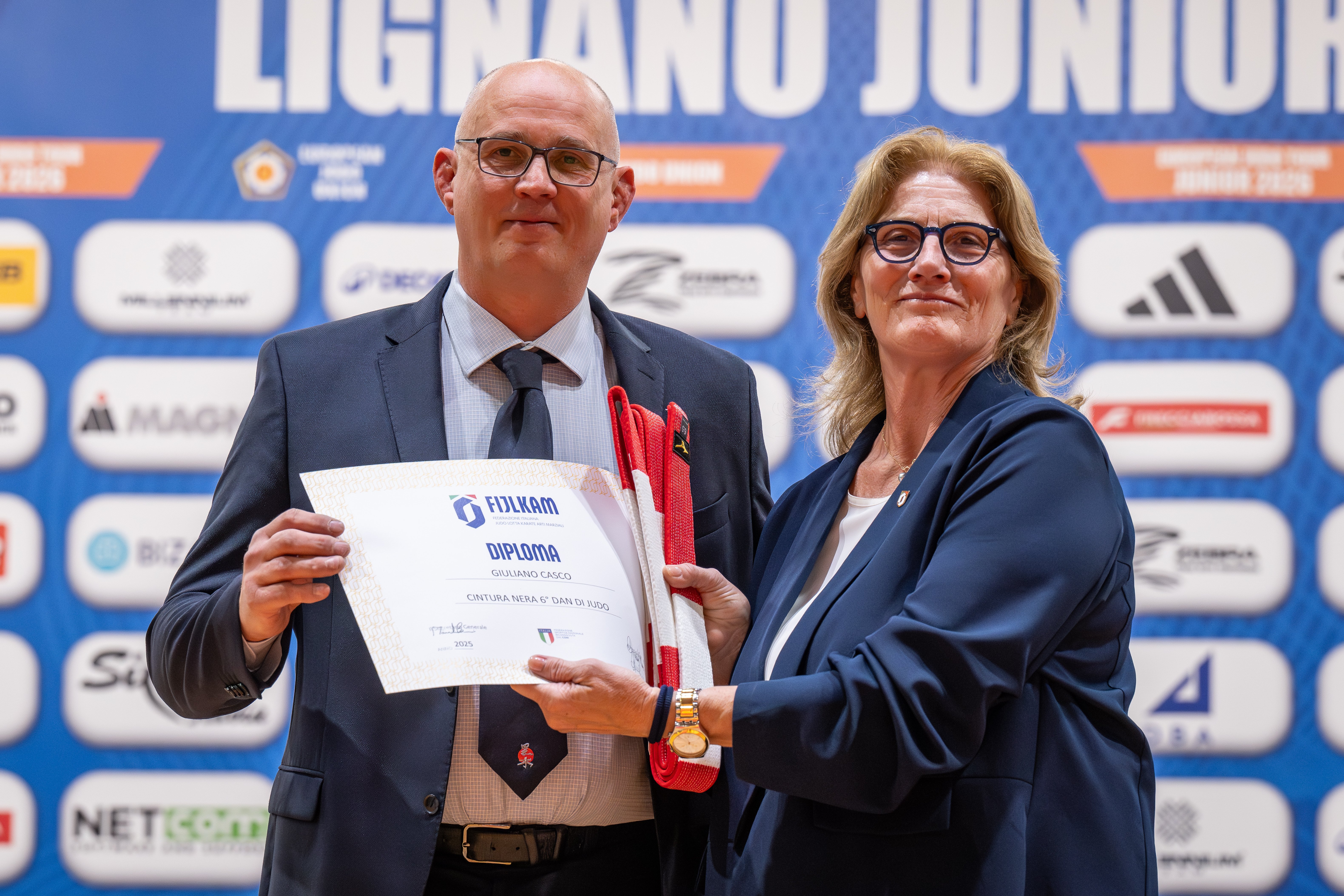 During the opening ceremony, the “Luigi Alberto Trevisan” award was presented to referees Tiziano Tieppo (ITA), Cathy Mouette (FRA), and Veli-Matti Karikanta (FIN). A special recognition was also given to Event Manager Gianluigi Pugnetti to mark the conclusion of his refereeing career. Further honours saw Giuliano Casco, president of Judo Kuroki, awarded the sixth dan, while Giuseppe Casellato, president of the Veneto Regional Committee, received the 7th dan.