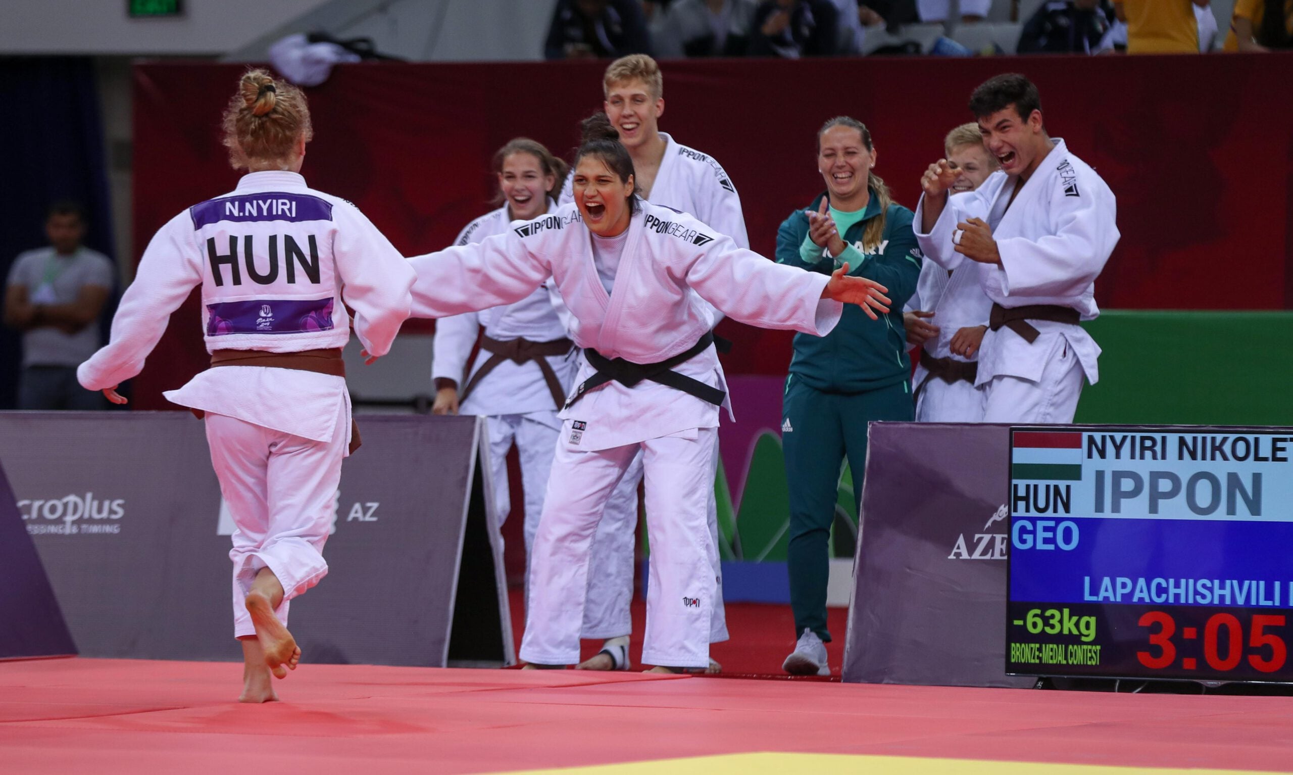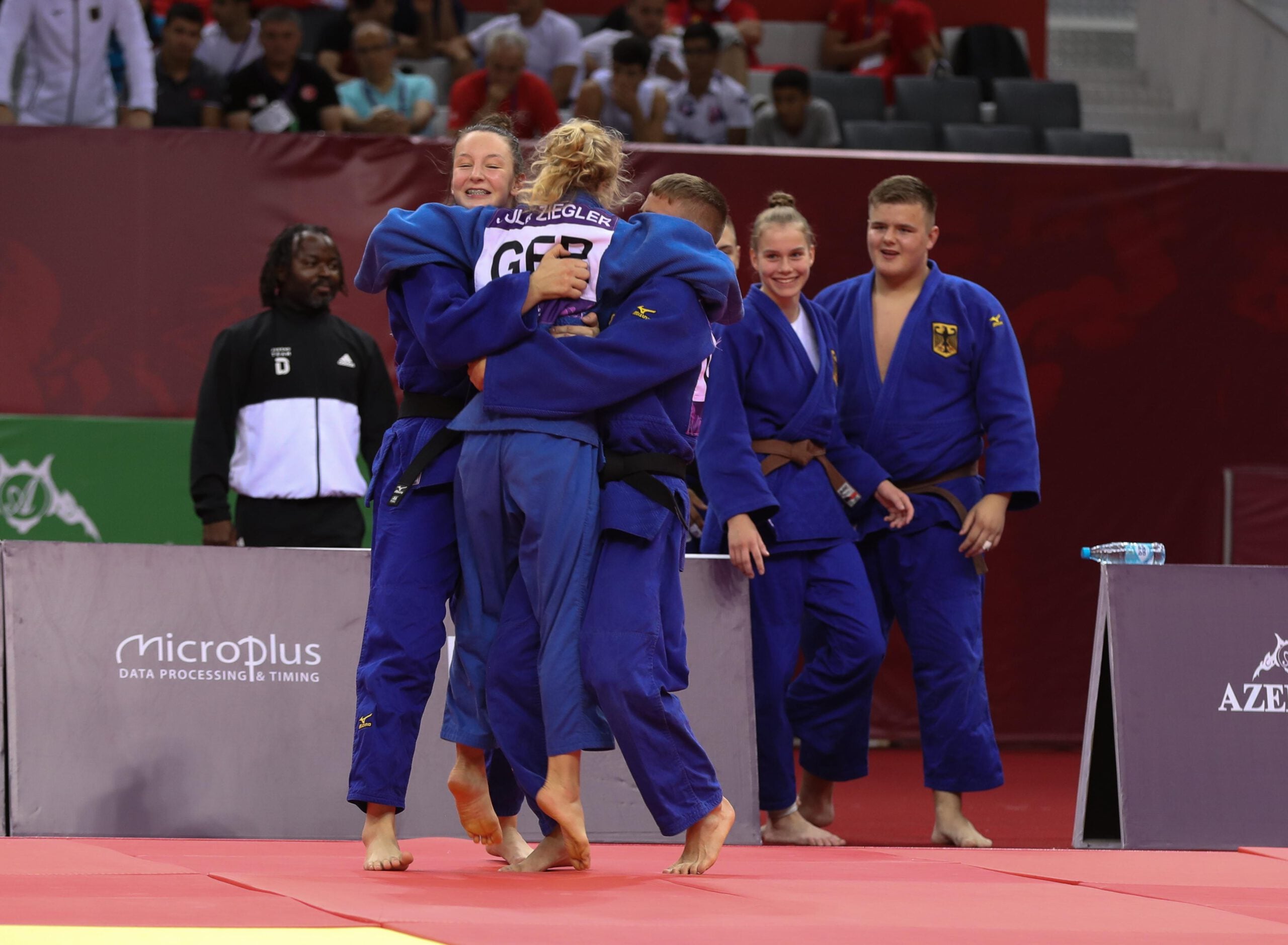 The Italians found themselves in a 3-3 situation but Veronica TONIOLO (ITA) took her team in to the bronze medal contest in the deciding match with a san gaku hold scoring ippon, ending the Azeri dream. Unfortunately Italy was put through their paces when they met a very strong German team. In the fight for bronze the Germans took the lead and the -48kg Jule ZIEGLER made it her mission to win the final contest to put her team on the podium, a huge success for the young squad.